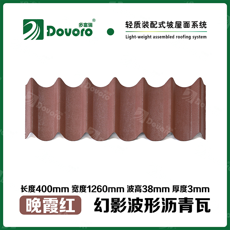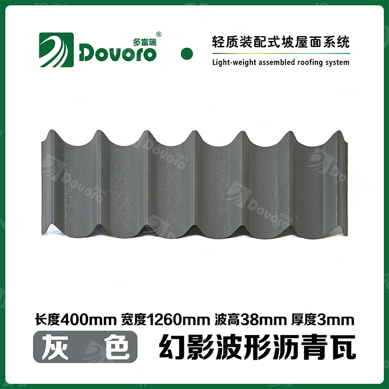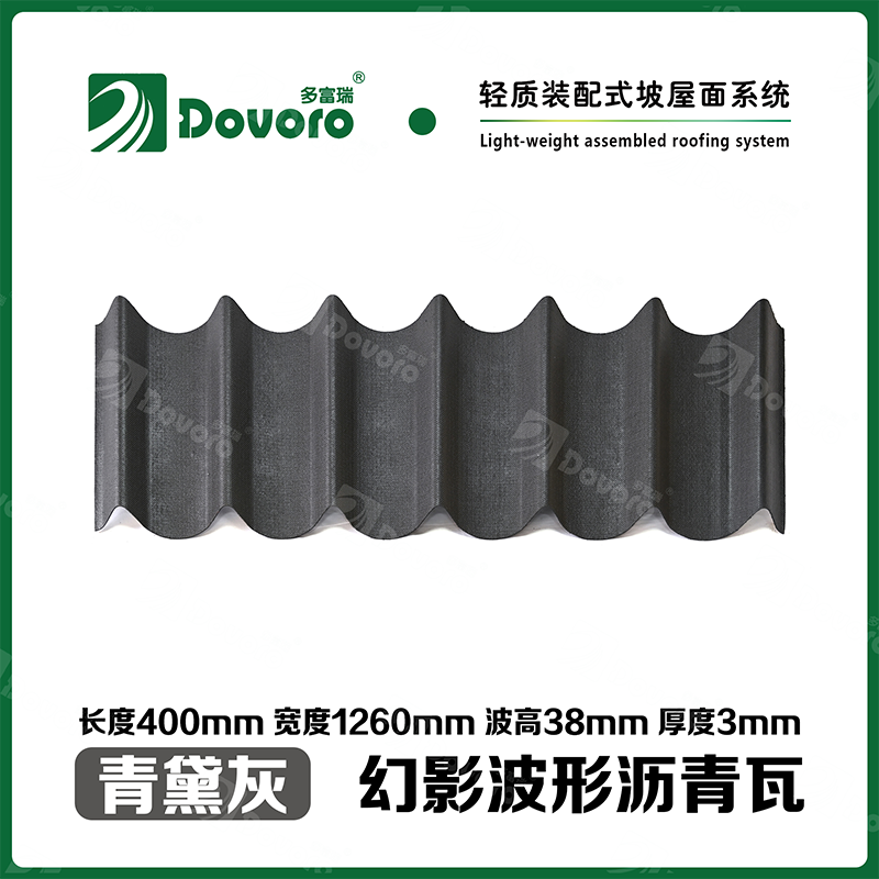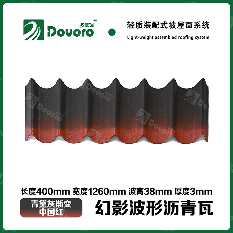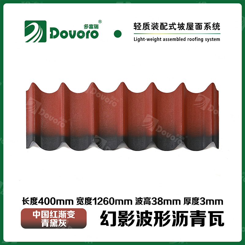 多富瑞幻影波形沥青瓦是由矿植物纤维板经过整形后浸渍沥青而成,一次成型的基层板在高温下浸渍沥青,使瓦材整体性更加牢固;热固性树脂保证了瓦材的强度和刚度;进口原料配合先进的着色工艺确保颜色持久、混色喷涂工艺使瓦材外观高雅、色彩美观、立体质感。