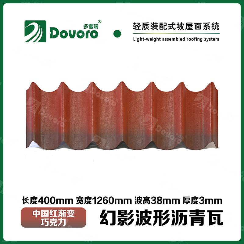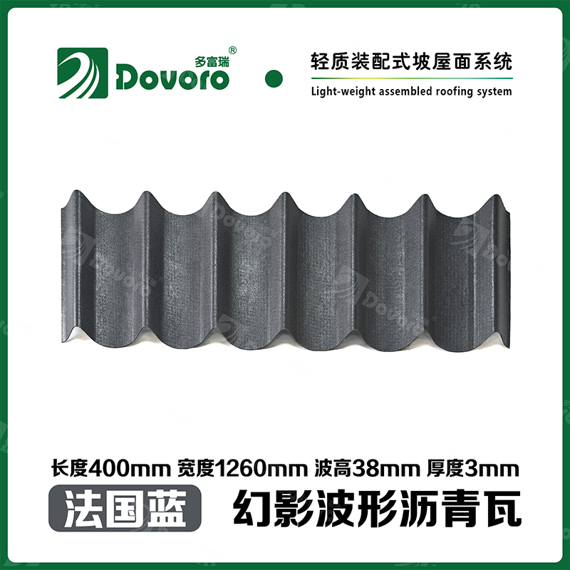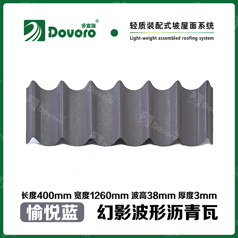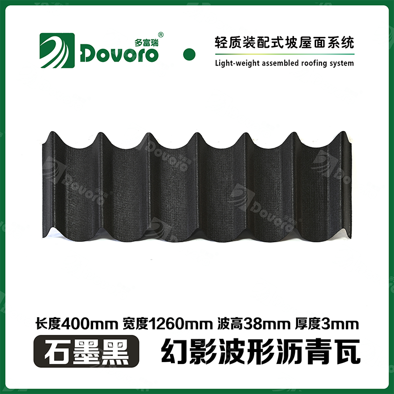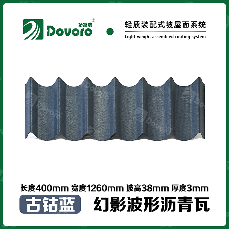 多富瑞幻影波形沥青瓦是由矿植物纤维板经过整形后浸渍沥青而成,一次成型的基层板在高温下浸渍沥青,使瓦材整体性更加牢固;热固性树脂保证了瓦材的强度和刚度;进口原料配合先进的着色工艺确保颜色持久、混色喷涂工艺使瓦材外观高雅、色彩美观、立体质感。