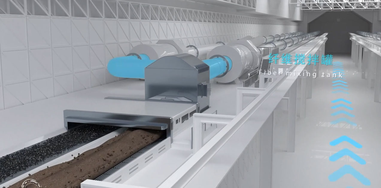 纤维搅拌罐→波纹板加工车间→纸板辊压机→沥青板传送机→沥青罐